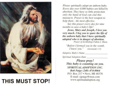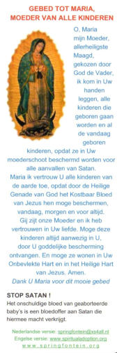 Help S T O P Abortions !!!1. Spiritual AdoptionYearly, 44 million (44.000.000) babies slain by abortion, this day have 120,000 babies! These babies have so little protection that only the hand of God can stop this slaughter. Our prayer is the best weapon to help them - the most effective. The innocent blood of aborted babies is a blood sacrifice to Satan who acquires this power. We must stop this, we must stop feeding Satan! The Old Testament gives us many examples were people sacrificed and even ate babies and children when they had fallen in idolatry and apostasy, and by this feed Satan and evil spirits. Nowadays Satan uses abortions to do this. To help stop the anti-life push around the world and the help stop this blood sacrifice to Satan, the late Archbishop Fulton J. Sheen encouraged the spiritual adoption of an unborn child. This is done by praying that the one particular but unknown child’s life be spared abortion and be allowed to continue to live.To help accomplish this, it was recommended an individual say the following daily prayer for a period of nine months.“Jesus, Mary and Joseph, I love you very much. I beg you to spare the life of [... baby’s name] the unborn baby that I have spiritually adopted who is in danger of abortion.”Prayer of Archbishop Fulton J. SheenHow does it work?It's very simple. Participants pledge to pray for nine months for a baby in danger of abortion. While this child will remain unknown to his or her 'spiritual parent', God knows who the child is. Many people have found that naming 'their child' helps to keep them focused on the reality that their prayers are helping to save a particular baby from the harm of abortion. More informatie? Visit the website www.spiritualadoption.org. On this website you can order the Prayercards and other material in Englisch.If you want to receive the Prayercards in Dutch (Nederlands), send an email to info@springfontein.org.Front Prayercard in DutchBack Prayercard in Dutch Front of Prayercard in Englisch Back of Prayercard in EnglischVoorzijde Gebedskaart in Nederlands Achterzijde Gebedskaart in Nederlands Voorzijde Gebedskaart in Engels Achterzijde Gebedskaart in EngelsWilt u de Gebedskaart in het Nederlands bestellen, If you want to order the Prayercard in Englisch,stuur dan een email naar info@springfontein.orgplease send an email to rjpaige@msn.com, website: www.spiritualadoption.orgPlease pray! The baby is counting on you! Pray also for the parents, they also need your prayers. Your prayer CAN save lifes!!!